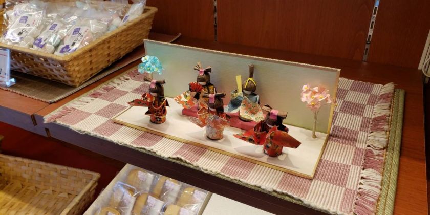 お店の季節感の演出として、ひな祭りの時期になると飾りつけます。古いものではないですが存在感のあるひな人形です。江口だんごではひな飾りと一緒に店内には桜の花も飾り、菱餅やひなあられ・桜餅等を販売しお客様にひな祭りや春を感じていただけるよう心がけています。