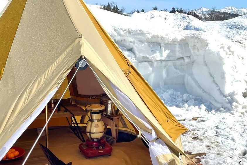 春~秋はオシャレなテント泊でアウトドアを満喫。豪雪地帯、川口の冬は古民家の和室でご宿泊。